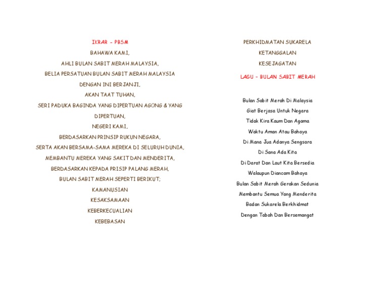 Muat turun halaman 51-100 di AnyFlip. Selepas kemerdekaan pada tahun 1957 cawangan di. Bulan Sabit Merah Di Malaysia Giat Berjasa Untuk Negara Tidak Kira Kaum Dan Agama Waktu Aman Atau Bahaya Di Mana Jua Adanya Sengsara Di Sana Ada Kita Di Darat Dan Laut Kita Bersedia Walaupun Diancam Bahaya Bulan Sabit Merah Gerakan Sedunia Membantu Semua Yang Menderita Badan Sukarela Berkhidmat Dengan Tabah Dan Bersemangat Lyrics.